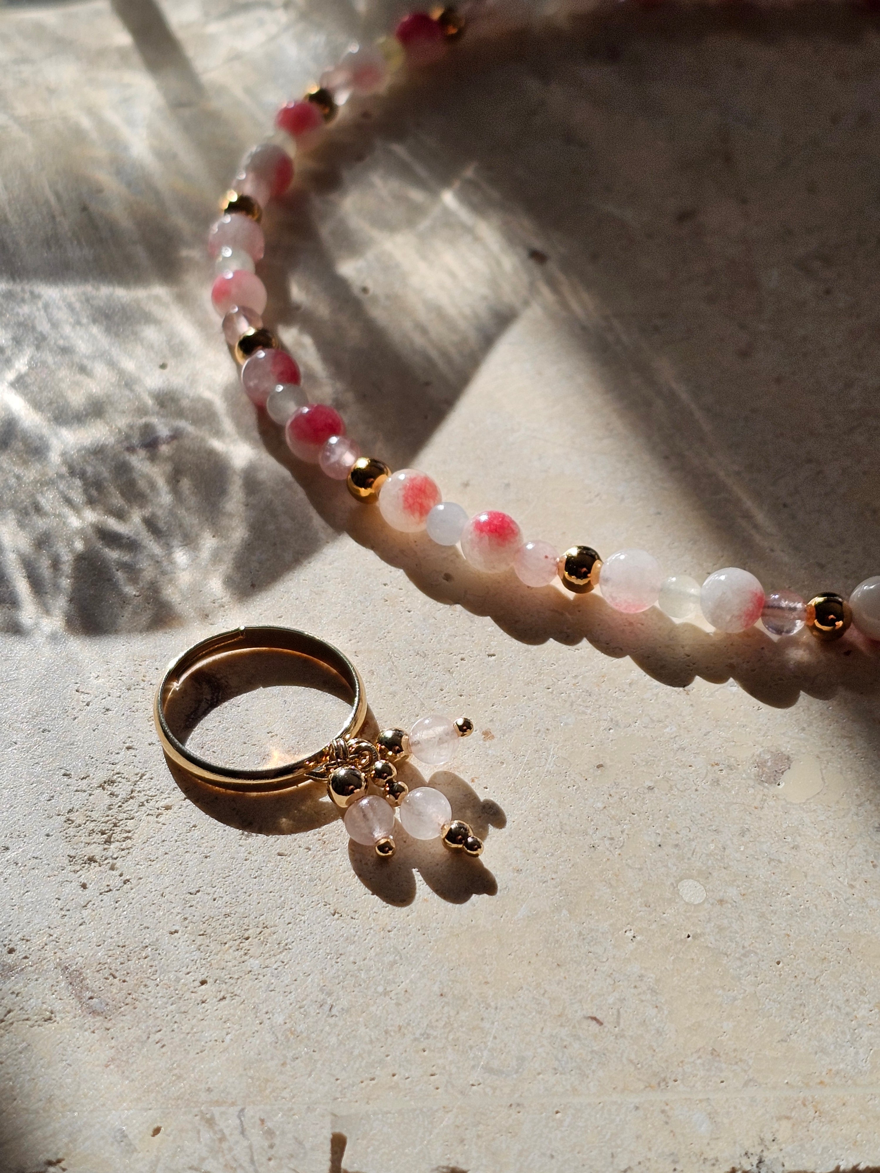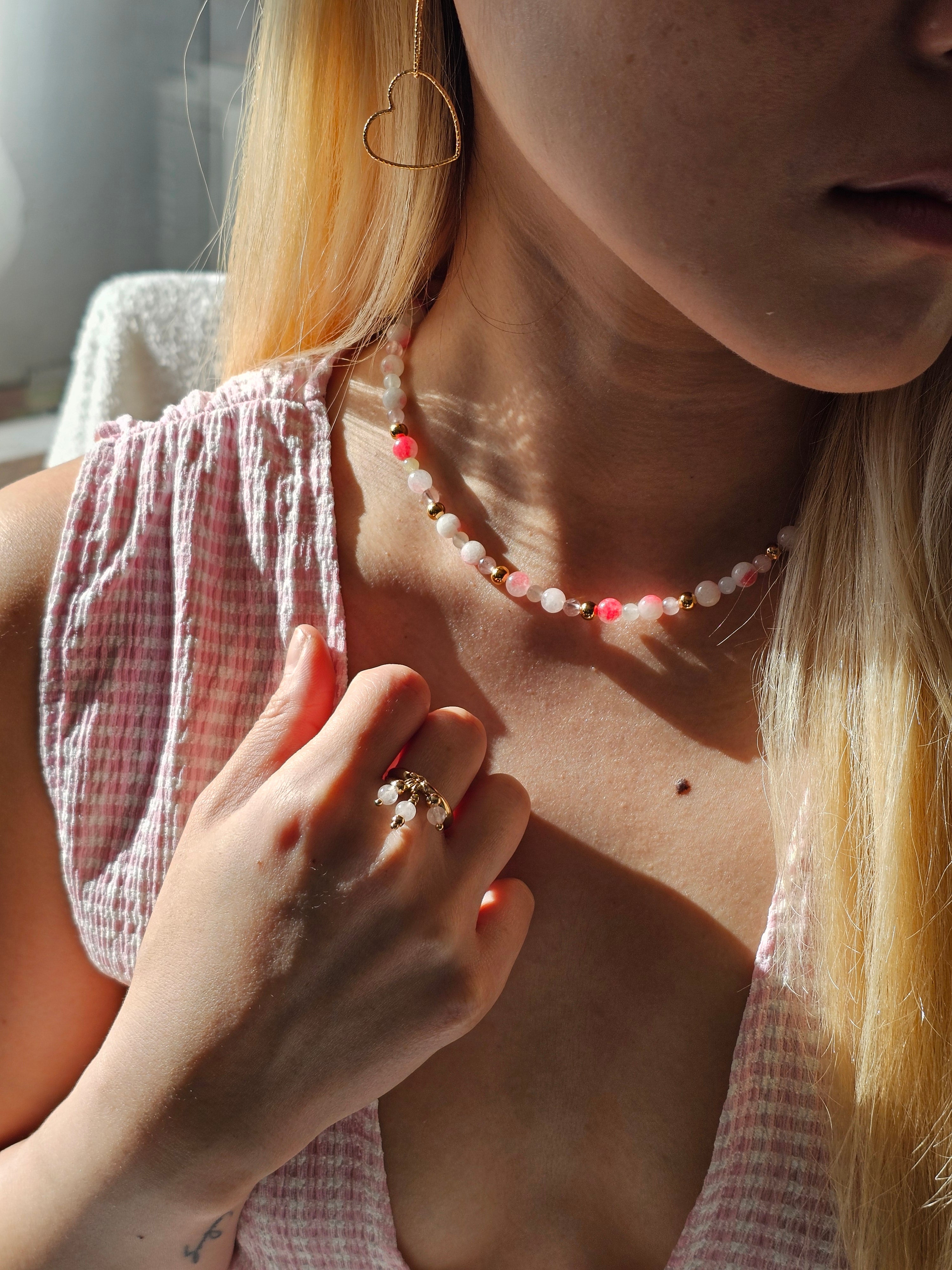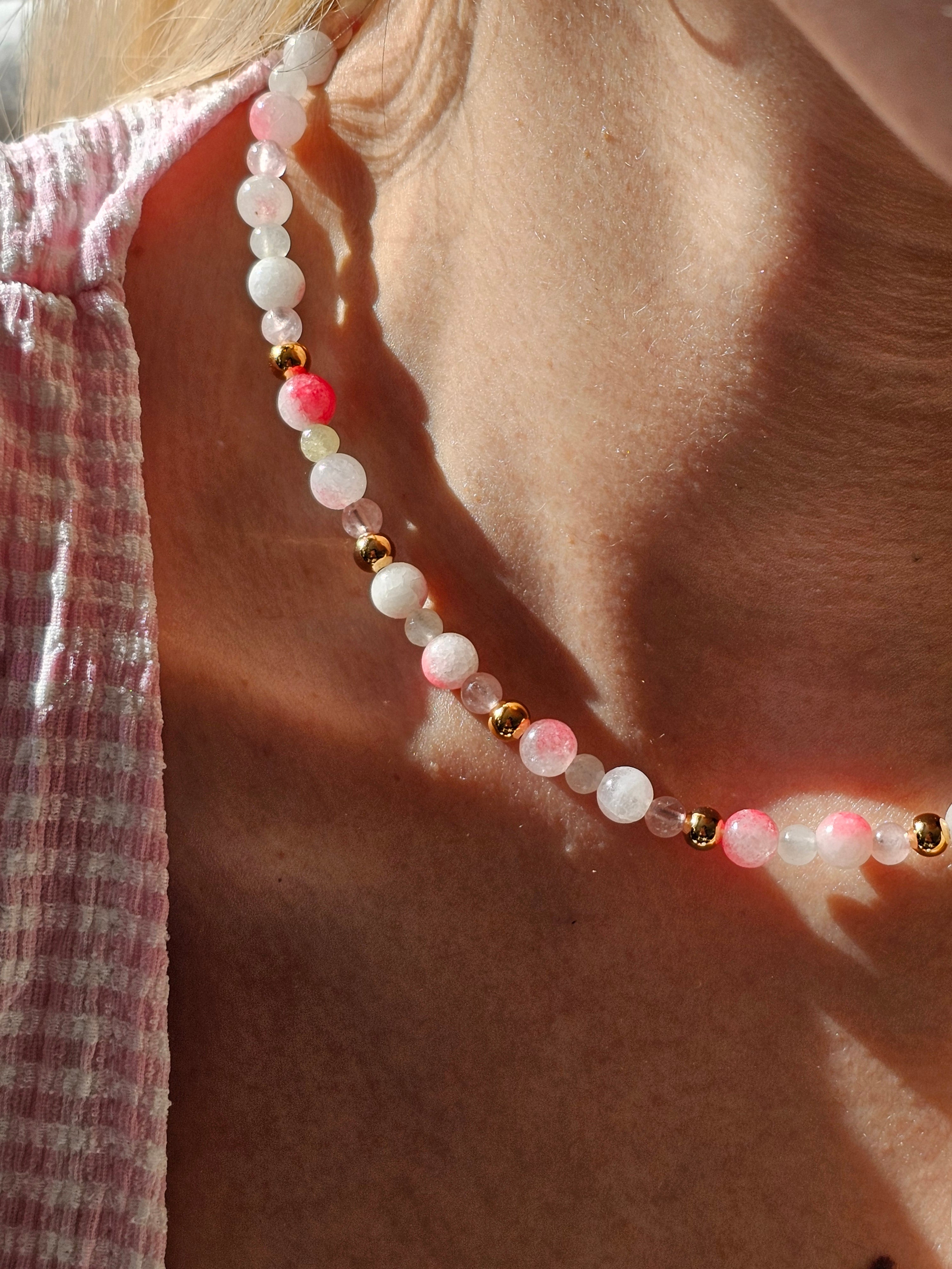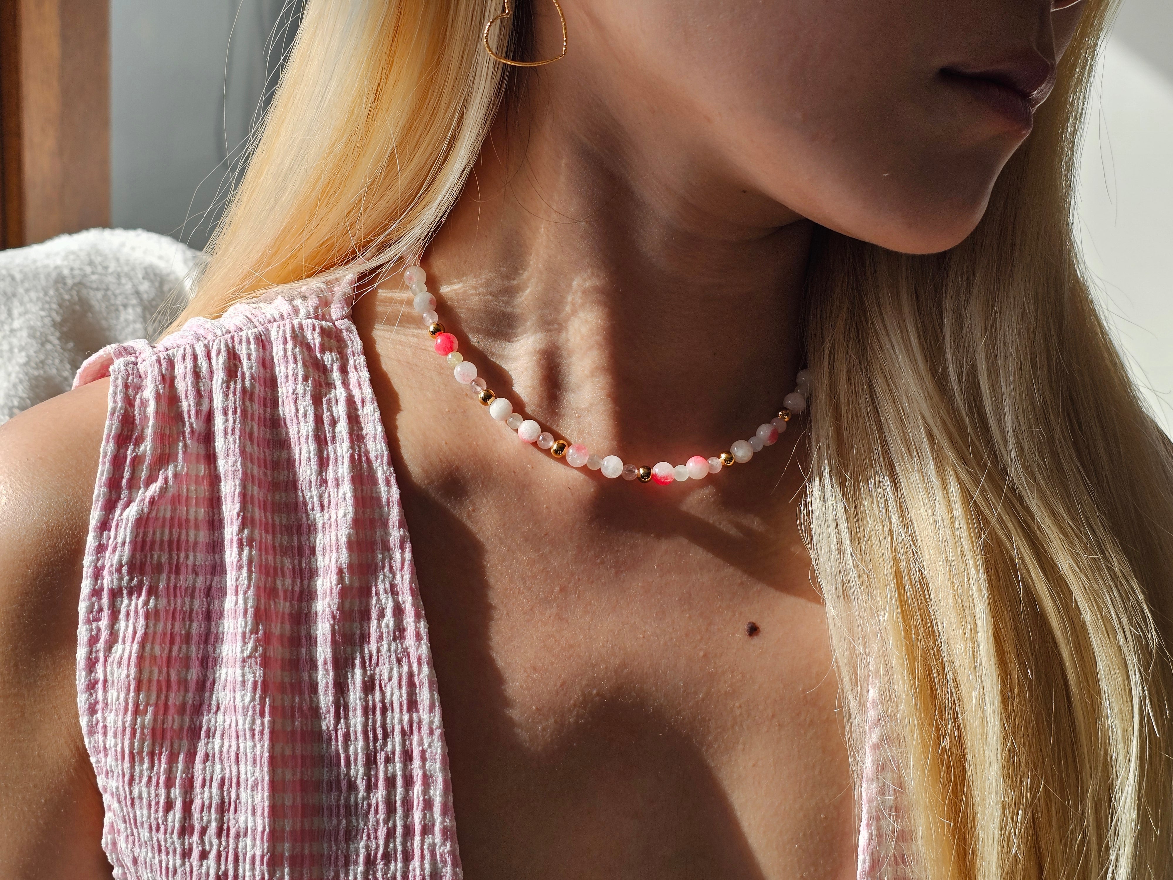 Un collier délicatement coloré qui apporte une touche lumineuse et douce à votre tenue.